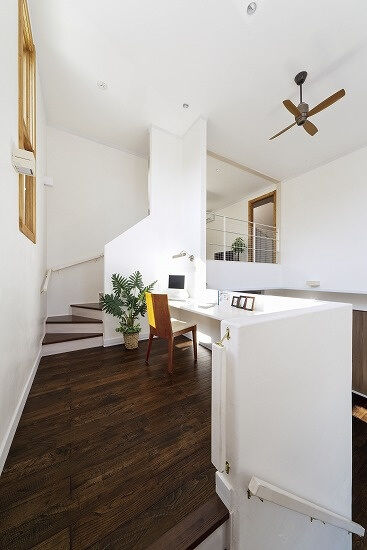 在宅ワークが増えた現代のニーズに応えるプランです。吹き抜けに面した2階ホールにカウンターを設けて書斎スペースとしたり、ガラス張りの小さな書斎を隣接させたりします。