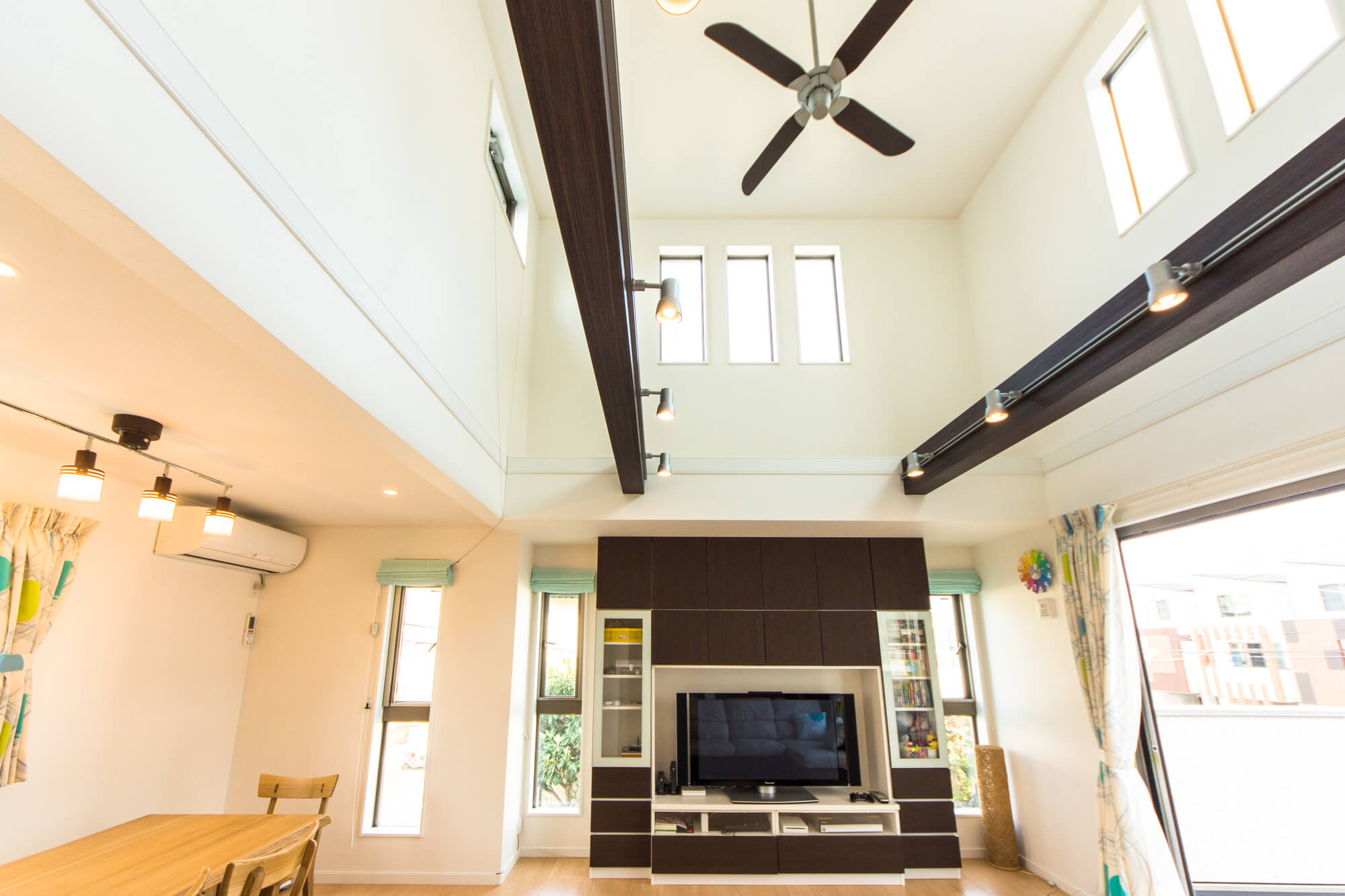 吹き抜けは、家全体の空気の通り道(エアフロー)としても機能します。暖かい空気が上にのぼる性質を活かし、シーリングファンや計画的な換気システムを組み合わせることで、家全体に心地よい空気の流れをつくれるのがメリットです。